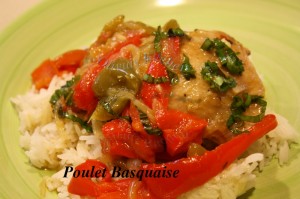 Tonight was a french night at our household . Although i started cooking this really late , i think it’s perfectly worth to try ! Poulet Basquaise is Chicken Basquaise , it almost tastes like Chicken Cacciatore , without all the italian herbs . Instead we used a lot of vidalia onions , green and red pepper , enough tomatoes , thyme and bay leaves , i also added a little of mild peppers and chipotle chili powder .It turned out very yummy , it does take a little time to cook the ragout , which is onion , green and red pepper , tomatoes etc .. But once everything…