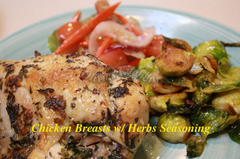 Then once you’re ready to cook it , heat up a little oil on the bottom of a skillet , on a high heat , sear the chicken breast , skin side down first , for about 3 minutes or 4 , and turned it , sear another 3 minutes . Then remove to a baking sheet , bake at 375 F , until meat is done , about 30-35 minutes , use a meat thermometer , set it to 160 F , and the meat should be nicely done . You do not want an overcook chicken breast !! You want a nice and juicy chicken breast . Do not cut the chicken right after you take it out from the oven , ,let it sit for 10-15 minutes , let it finished cooking , and let the juice distribute all over .