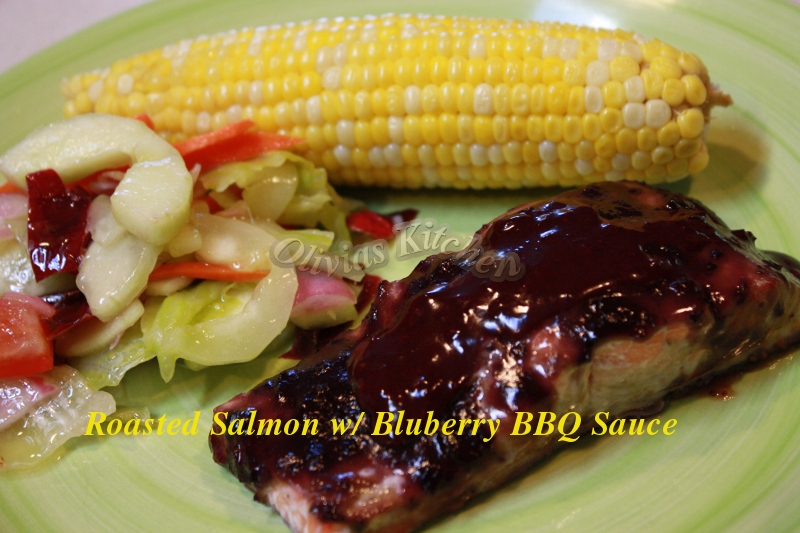 So , this recipe was quite delicious , the blueberry BBQ sauce , to my surprise was quite easy and quick to make . And the fish doesn’t take long to be baked wither . I paired this fish with baked potatoes and corn on the cob for my husband and my son , and as for me , i skipped the potato , and instead i paired it with summer salad , which i literally can eat everyday with anything , and also had it with corn on the cob , another favourite of mine !