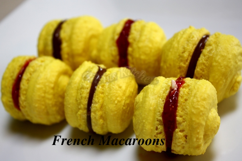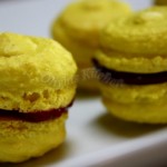I made another attempt to perfect my macaroons , okay , the previous one , almost made it perfect , but that one used italian meringue technique , and tonight , i made it with french meringue technique , which less mess and i was almost sure , that it would turn out pretty this time .. Well .. half way t hrough the baking time , i realized i forgot to double the baking sheet .. causing the shells to crack .. although some of them have the feet , but not all of them , and ones that don’t have feet are cracking badly .. only 20% of the batch turned out pretty okay .. after i rushed and doubled the baking sheet when it was half way baking !!