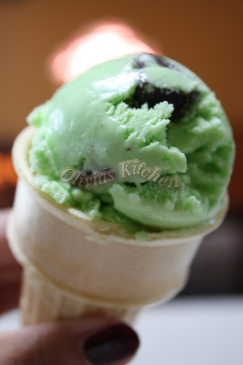The next morning , add 3/4 tsp. of peppermint extract , green food coloring ( gel paste ) and then add chocolate chunks . The chocolate chunks should be added during the last 5 minutes of churning .