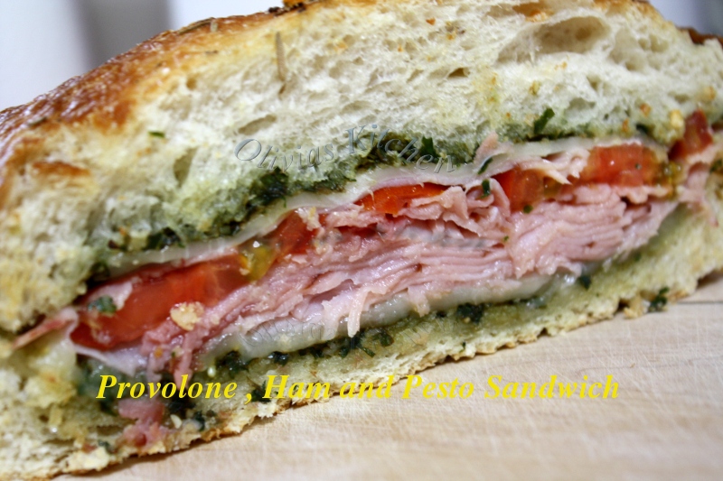 This is one my summer favourite , pesto , I grow my own basil during spring / summer , and i found out how easy to make pesto , especially during summer months , where i can just go out and get some fresh basil and turned them into a yummy delicious pesto ! You can use pesto for a lot of thing , but my favourite is to use pesto in a sandwich , i heard about pesto for pasta too . But never tried it before .. So here is my pesto recipe , the only down thing is that pine nuts are so expensive , if you can find a place that sell them in bulk it might be cheaper than buying at the regular grocery store , if not , well i guess stick with store bought pesto , since the pine nuts for 1 small bag , which is only 1/2 cup , costs almost $5.00 , the same price with a store bought pesto . But of course home made tastes a lot better and no preservatives .Picture below is , sandwich that i made , pesto , provolone , roasted maple ham and tomatoes , on a foccacia bread . Wrap with foil , bake at 400 F for about 15 minutes , until the cheese melted .