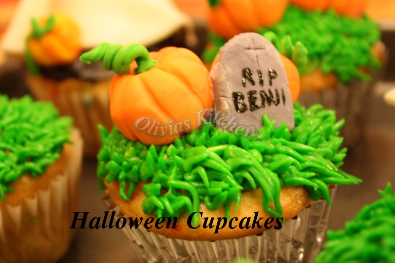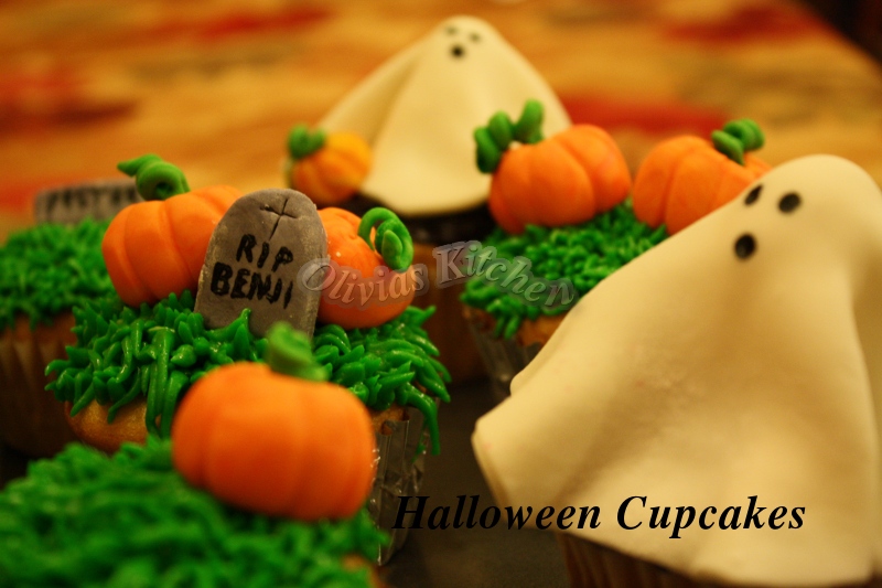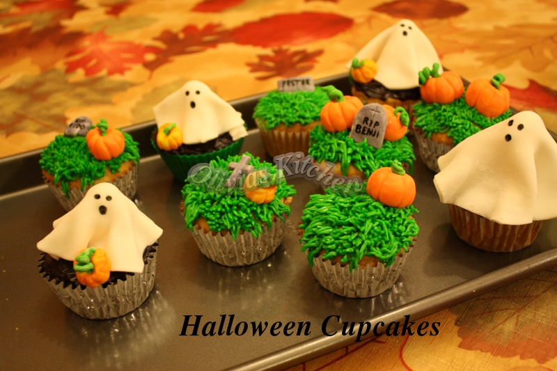 The boys asked for me to make some cupcakes today , with its famous yummy smooth icing , french butter cream icing . And i ended up making a huge mess , playing with fondant . The icing was very quick to make , which wasn’t a big deal at all . But we’re just having fun making the pumpkins , the tombstones and the ghost . It took time , but wasn’t bad at all ..