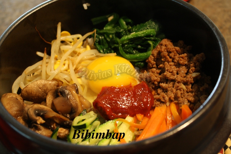 Add sesame oil on your bowl , then add hot rice in it , add the rest vegetable like the picture and 1-2 tbsp. of hot pepper paste and mix !