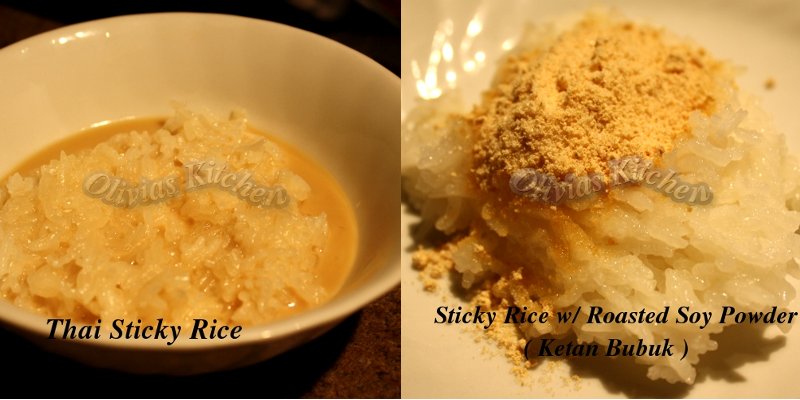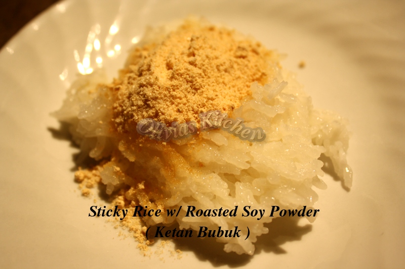 Until i finally thought about this sticky rice .. then i remember .. Ketan Bubuk .. sticky rice with roasted soy powder !! So easy to make ..Now .. while i was thinking about Ketan Bubuk .. i also thought about the Thai Sticky Rice that i had the other night . I happened to have coconut milk on hand .. so there it goes .. i made thai sticky rice , without the mango .. normally that’s what the sticky rice served with , or in my case , the dessert i had at the restaurant was Sticky rice with Thai custard .. one of these days i will try to make the custard 🙂 Anyway .. here is my sticky rice snacks