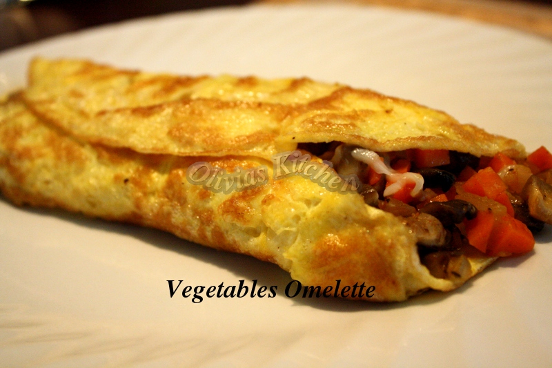 – For just 1 person’s serving , i would use 2 large eggs only , and add little splash of water or milk . And chopped some veggies , whatever you have on hand , red pepper , green pepper , mushroom , onion , carrot , celery , etc .. whatever you have on hand , it’s not limited only with veggies i mentioned here , like i said whatever you have .. use it . I would cook the veggies first then i would add it to the omelette as i cook . To cook an omelette , grease the skillet , don’t load it with oil , just enough to cover the surface so it won’t stick , then beat the eggs with water , and pour the mixture when the skillet is heated , then let it sit for a minute or two , using spatula make sure it doesn’t stick around the edges . When it’s about done , add your fillings , and sprinkle with cheese , i used mozzarella . The cheese acts as the glue here , so if u don’t care for cheese , just add a little , no need to add too much , but if u like them , feel free to load it up . Lift one side to cover the filings with the cheese , slide it to the plate , and fold the other side into the center . Serve warm .