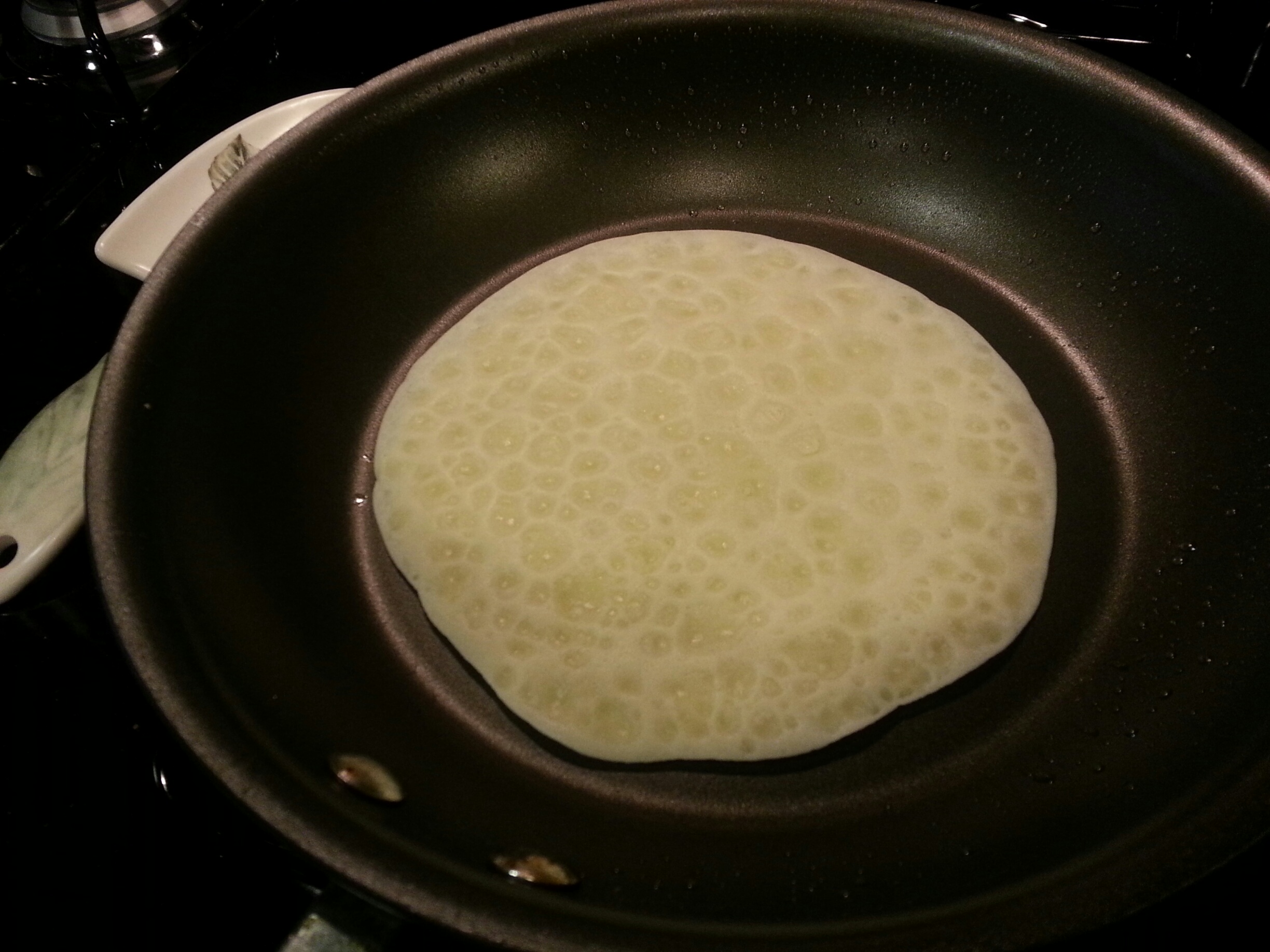 In a large bowl , make a well in the center of the flour , then add your eggs , start whisking , then add melted butter , and whisk . Then add your water a little bit at a time , and keep whisking until it’s smooth . The consistency of the batter will be very runny and you want it that way , it’s not supposed to be thick . In a small non stick skillet , add just a little bit of oil , then wipe it all over with paper towel , heat up over medium low heat , then add the 1/4 cup of the batter , and swirl around the skillet , cook about 1 minute on each side , Set aside , while you prepare ragout filling .