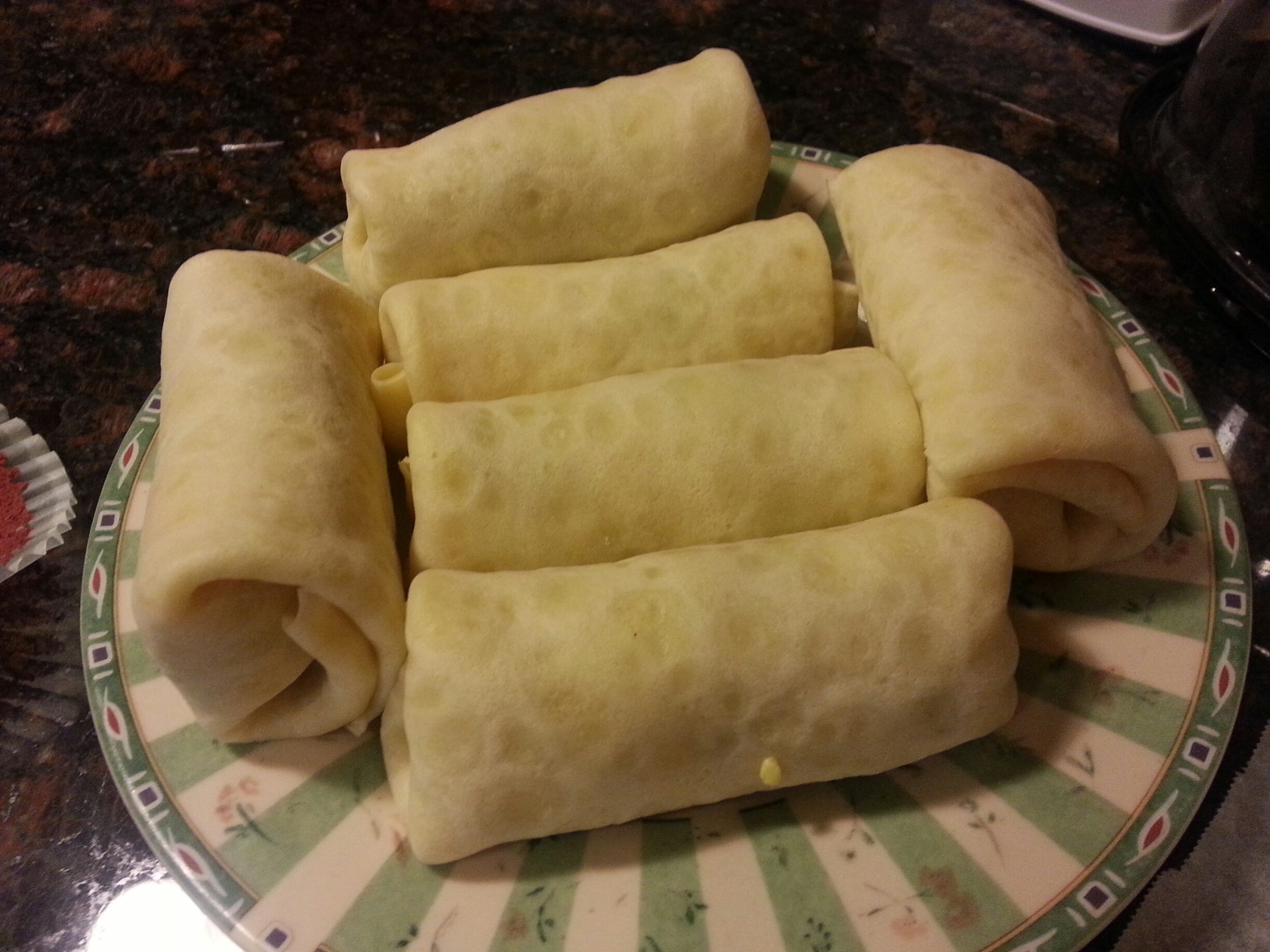 Once everything is cool , let’s wrap it . Lay the wrapper , then add about 1-2tbsp. of the filling , then wrap them like you wrap lumpia . Then using flour mix with water ( should be very thick consistency ) , use it as a glue when you’re done wrapping / rolling them . Then dip it in the beaten egg , and then roll it on the breadcrumbs . Deep fry , please watch it because it turns brown VERY QUICKLY , probably about 10-20 seconds , ( heat on low ) turn the risoles , do the same on the other side .