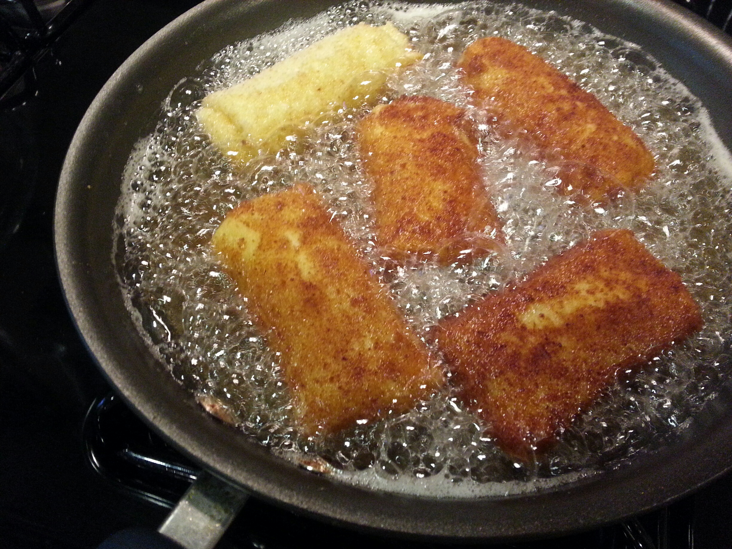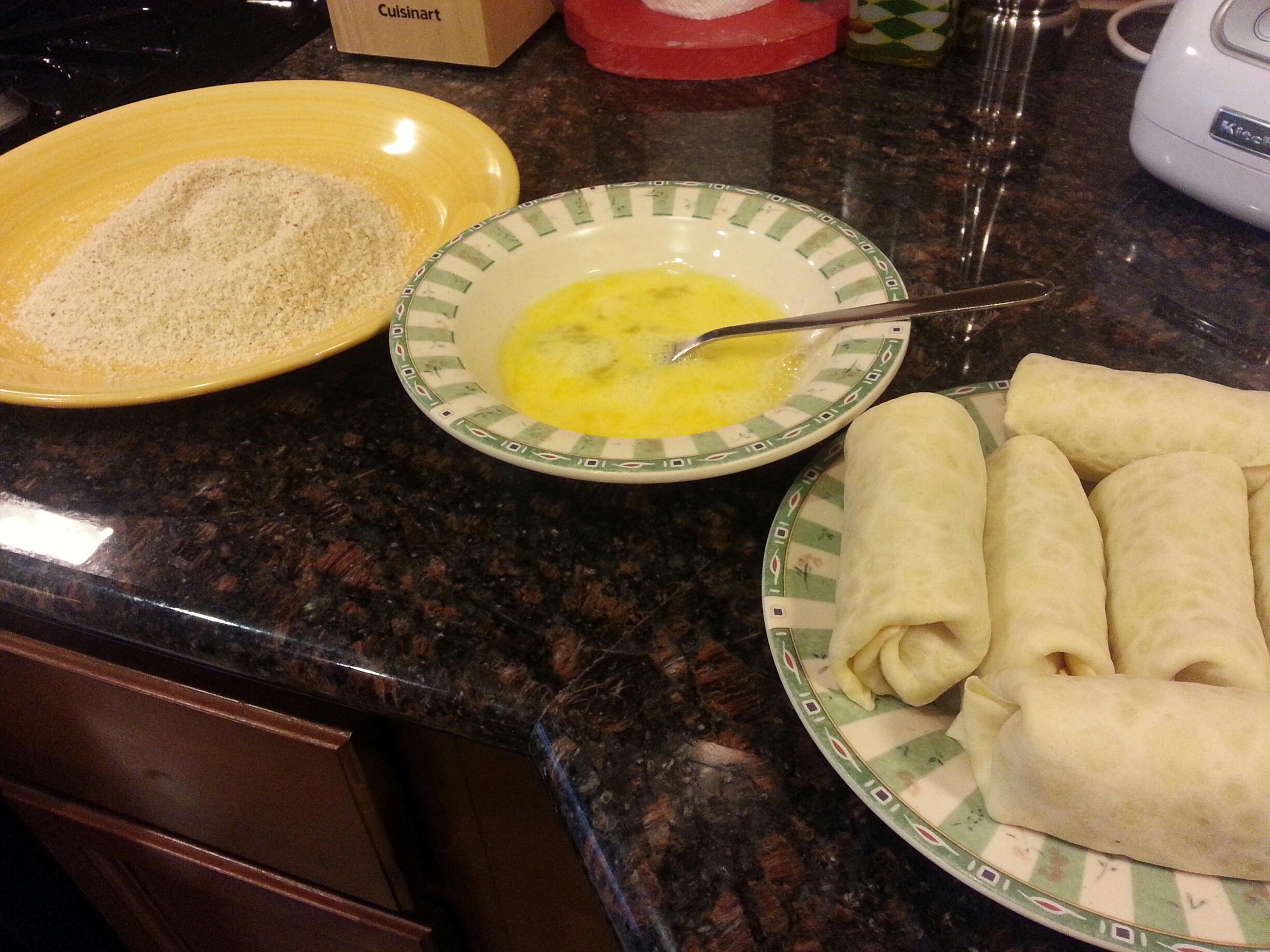 This is your working station , line them up in order , your risoles , egg wash and bread crumbs , then skillet with heated oil . Dip in egg , roll in breadcrumbs , fry in oil .