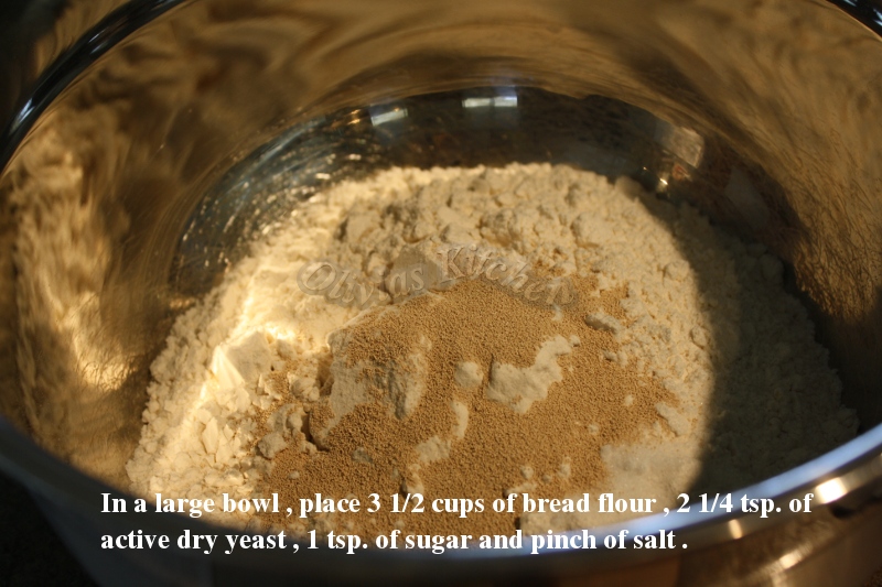 In a large bowl , place 3 1/2 cups of bread flour , 1 tsp. sugar , 2 1/4 tsp. of active dry yeast and pinch of salt . Mix them together , with spoon or hand , whatever , just mix them up .