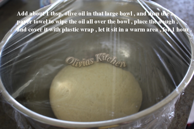 11. Now , add 1 tbsp. of olive oil in your large bowl , then wipe it all over with paper towel . And place your dough in the bowl , make sure you turn it around so it won’t stuck to the bowl later on . Let it sit in a warm place for an hour to rise .
