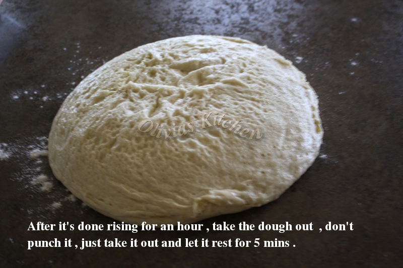 13. Once it’s done rising , let’s take the dough out from the bowl , DO NOT PUNCH IT DOWN ! Just take it out , like you’re pouring something out from a bowl , it should slide out easily because of the olive oil around the bowl .