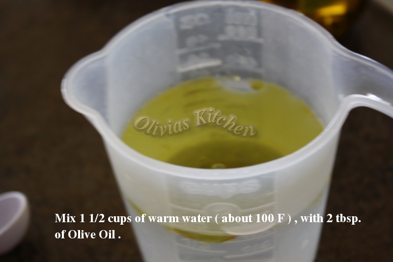 3. Mix 1 1/2 cups of warm water ( about 100 F ) , and 2 tbsp. of olive oil .