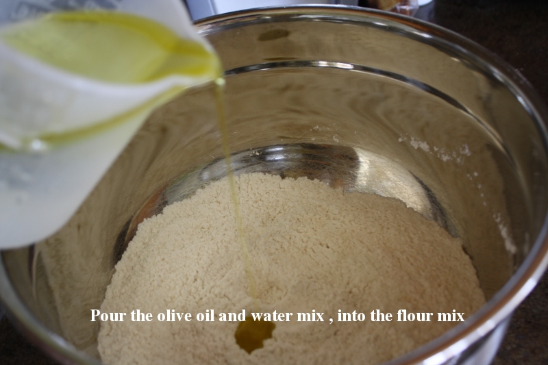 4. Pour the olive oil and water mix into the flour mix .