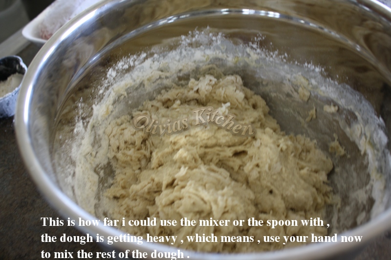 6. When you use your mixer or spoon , you can only go so far with the dough , because it started to get heavy , and you might burn the motor of your mixer ( unless you have standing kitchen , but then again we won’t learn about this , right ? ) . So , stop with the mixer or spoon , and start to use your fingers .