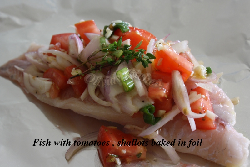 Super easy and simple dinner , everyone can make this . If you love fish , try this one . All you need is just tomatoes , shallots , or onion if you don’t have shallots , green onions , thyme , lemon , oregano , and garlic , oh and olive oil . Just chop everything and mix them with olive oil , and salt and pepper .. and there goes tomatoes mixture .. it looks and smells so good !!