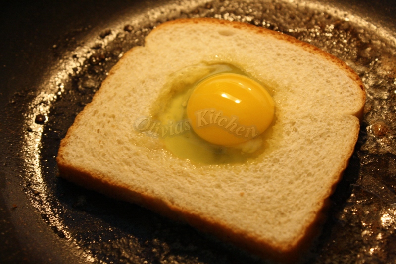 1. Melt butter or margarine in a skillet , medium low heat . While it’s heating , grab 1 slice of bread , then make a hole right in the middle of the bread , don’t have to be perfect , just make a hole , not too wide , if it’s too wide you will end up having to put 2 eggs in . Then , place the bread in the skillet , and crack 1 egg right in the hole of the bread .