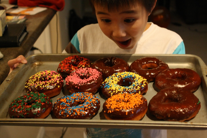 So , there i was , mixing the batter and stuff .. i’ve got everything on hand , there was nothing in particular that i needed , it was a quick process making the dough . As always with any bread stuff , waiting period is the longest time . Then i thought .. what am i going to cut these doughnuts with ? i didn’t have any biscuit cutter .. i didn’t have doughnuts cutter , eventually i picked a cup , and i floured the edges and using it to cut the doughnuts , and for the hole in the middle i just had to cut it manually with knife . Not so perfect but .. at the end , i was happy with the result ! And my son was happy with it too … if you couldn’t tell from his look !! 😀