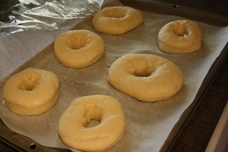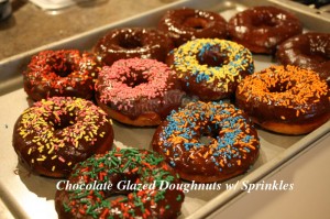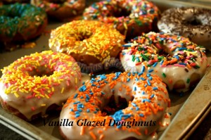 Mix all these together with the yeast mixture . Then add 1/2 cup more all purpose flour , and you might need more if the dough is too sticky , it needs to be elastic by the time you’re done kneading it for 8 minutes . So it depends on your humidity in your area .. you could need more or less than 2 1/2 cups . I used almost 3 cups of flour . Once you are done kneading , place in a buttered bowl , and cover with plastic wrap in a warm area until it doubles . About 1 hour  Then roll the dough out in about 1/2 inch thickness , and using a doughnut cutter , cut the dough . Place in a cookie sheet and cover with plastic wrap , let it sit again in a warm place to double in size for about 1 more hour .