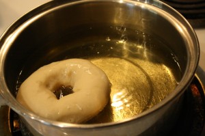Then heat up oil in a small pot , and fry the doughnuts until golden brown . Becareful because it gets brown really quick . Set aside once it’s done .