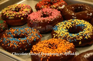 Heat milk , butter , vanilla and corn syrup in a small pot . Then turn the heat low , add in the chocolate chips , whisk , keep whisking until melted . Add 1 cup of powdered sugar , and keep whisking . Turn the heat off , and use the glaze immediately on the doughnuts . Dip in , and place on a parchment paper , and decorate , or just serve plain .Â