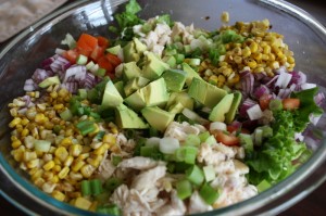 I learned how to make taco salad a while ago from my husband’s friend , though it didn’t seem like it’s the healthiest since it’s using ground beef , and then dorito’s LOL .. plus soaked with western dressing . Just recently i found a recipe that seems like pretty healthy with everything home made , except for the tortilla chips . I wasn’t sure how this would taste , because the dressing was pretty sour when i tasted it . But once i mixed it with the salad itself , as long as you don’t flood your salad with the dressing , this will make a good dinner salad .
