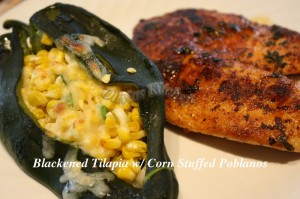 This time i bought tilapia , and i mixed my own blackened spices and this was a super quick easy dinner , you can always serve this with rice or potatoes or other veggies , i happened to serve it with corn stuffed poblanos . They’re not too bad either , just taking the time baking the pepper and corn . If you’ve tried mac and cheese stuffed poblanos , this is almost like that one too .