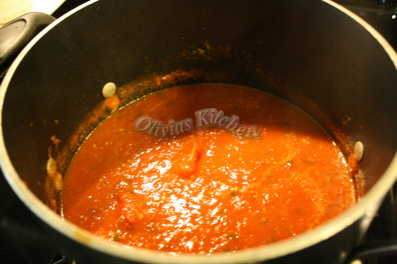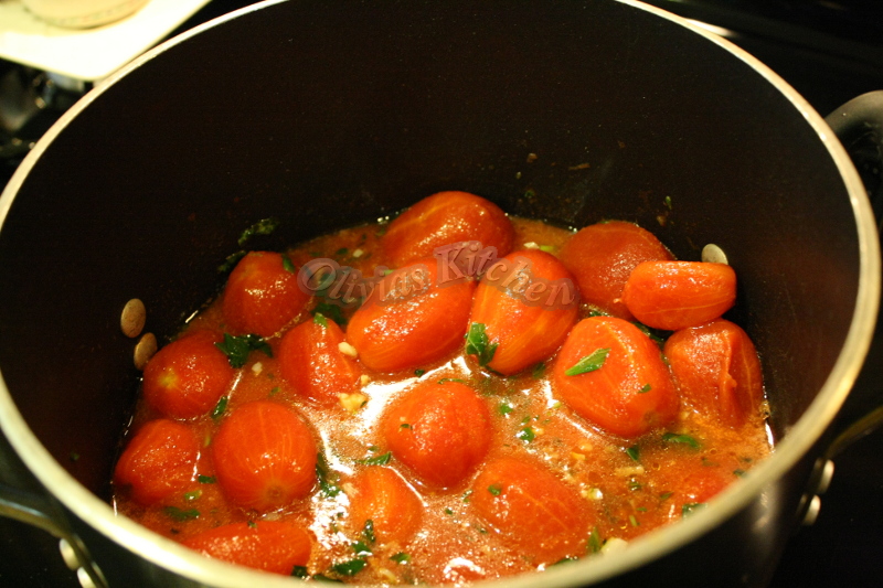 1. In a pot , heat olive oil , then add garlic and the herbs , cook for a minute . Then add the the whole peeled tomaotes . Bring to boil , add salt , pepper and sugar . ( just eye ball it , if you think it’s too acidic , add more sugar , if not , just add very little )