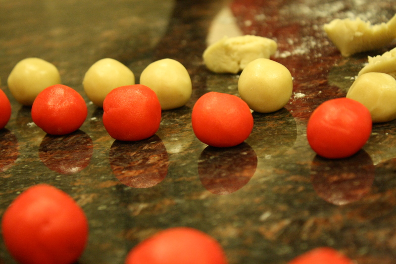 3.Roll the dough into small balls , make the same amount between the whites and the reds .