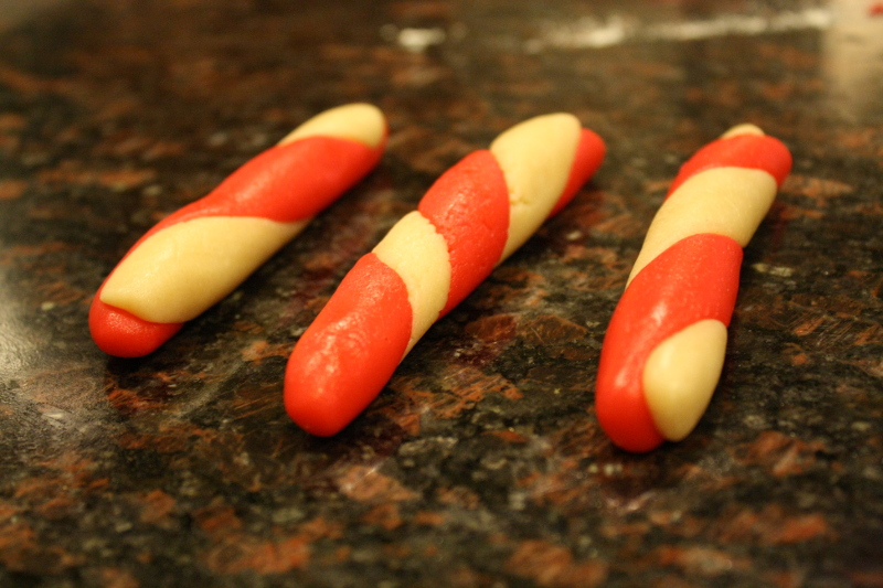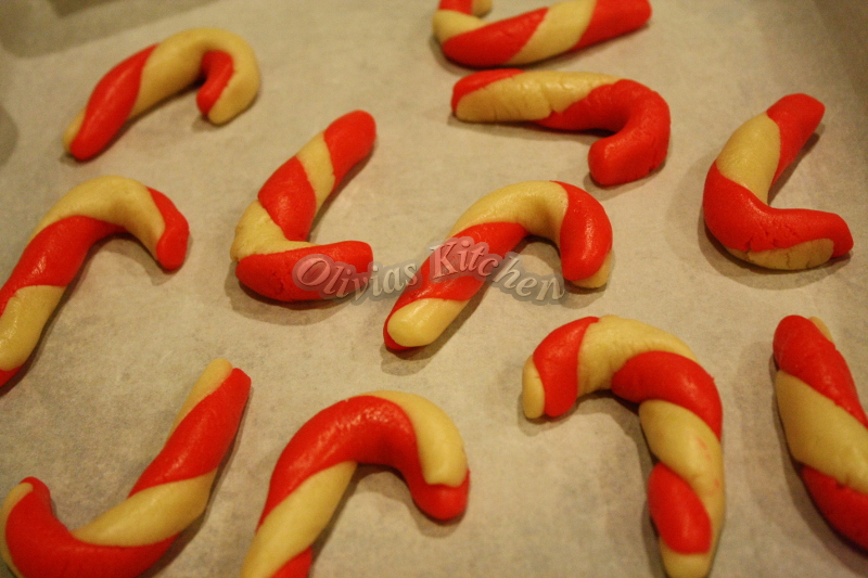 5. Once it’s done , transfer carefully to a cookie sheet lined with parchment paper , and curl the end gently to shape them into candy cane . Bake at 375 F for about 12 minutes or so .