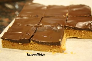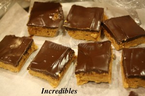 Incredibles is my husband’s favorite holiday sweets . I , on the other hand , don’t really care too much for it . I like sweets but this one though was way too sweet for me . Even as i was making it .. i could taste the sweetness in the air , as i was adding the powdered sugar into the batter . I thought .. dang .. too sweet .. But apparently lots of people like this bar . It does remind you a lot of reese’s peanut butter cup .