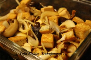 Browsed around Korean Food website ” Maangchi ” and i found this recipe . I like tofu , but i am not a big fan of anything pickled . Because in my opinon they’re way too sour . But looking at her recipe and her video , i thought dang .. it looks really yummy . Oh well who cares why not trying it . I happened to have 3 packages of firm tofu in my fridge , we went to korean market the other day .