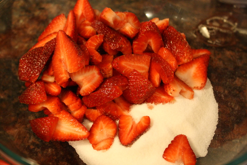 About 4 cups of sliced strawberries , i used about 1 1/2 lbs of fresh strawberries , rinsed , and hulled , then sliced .