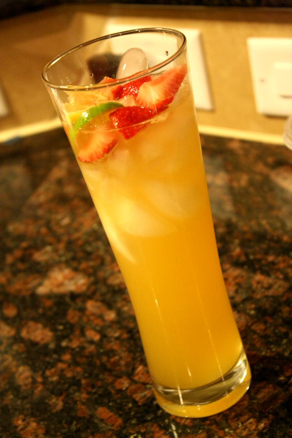 In a glass pitcher , add the fruits , then the orange juice , the syrup ( using a strainer you don’t want the ugly looking dark mint leaves in the drinks ) , and refrigerate until ready to serve . Then right before serving pour the prosecco , i actually found 2 cups of mint syrup a little bit too sweet , though i have sweet tooth , i ended up adding few glugs of riesling , since that’s the only one i had on hand . Serve with crushed ice or ice cube .