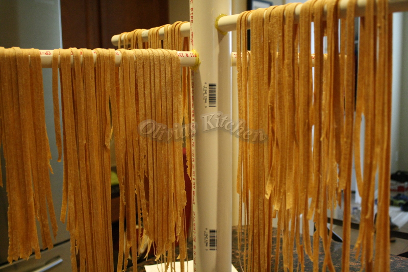 Here is our fresh pasta drying on the pasta hanger . I made it in the afternoon , about 5 hours later , they’re all totally drying pretty well . So after that i decided just to store them and used it the next day.