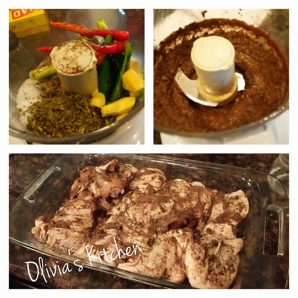 1. Blend all ingredients in food processor until mixture becomes smooth and pasty , marinade your chicken thighs with the spices . Rub all over the chicken and let it marinade for at least an hour , up to overnight .
