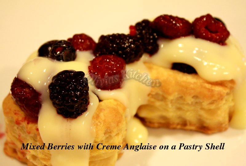 1 box of pastry shell , bake as directed . Remove from the cookie sheet and cut the middle out to make a hole that you will fill with the creme anglaise and berries .