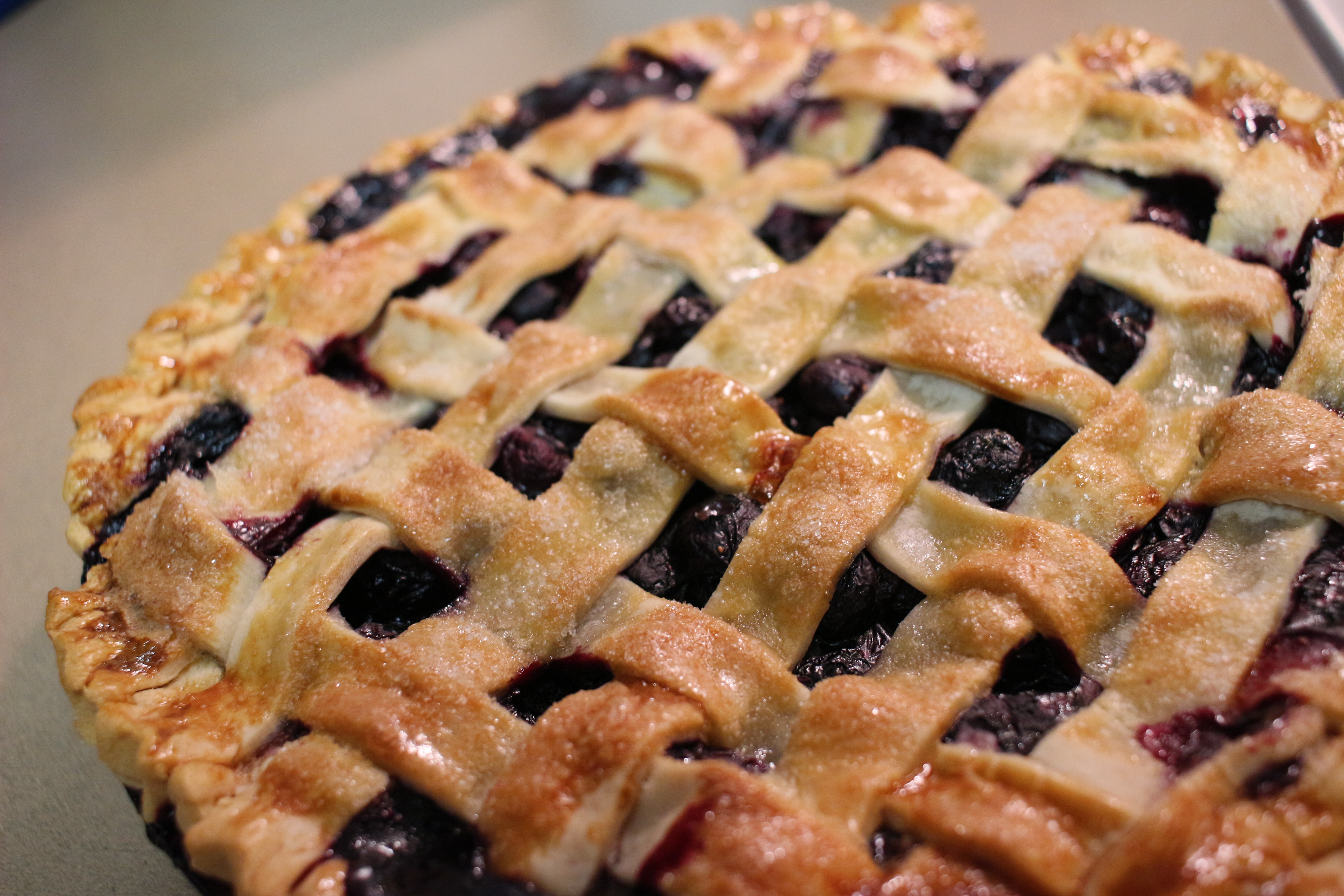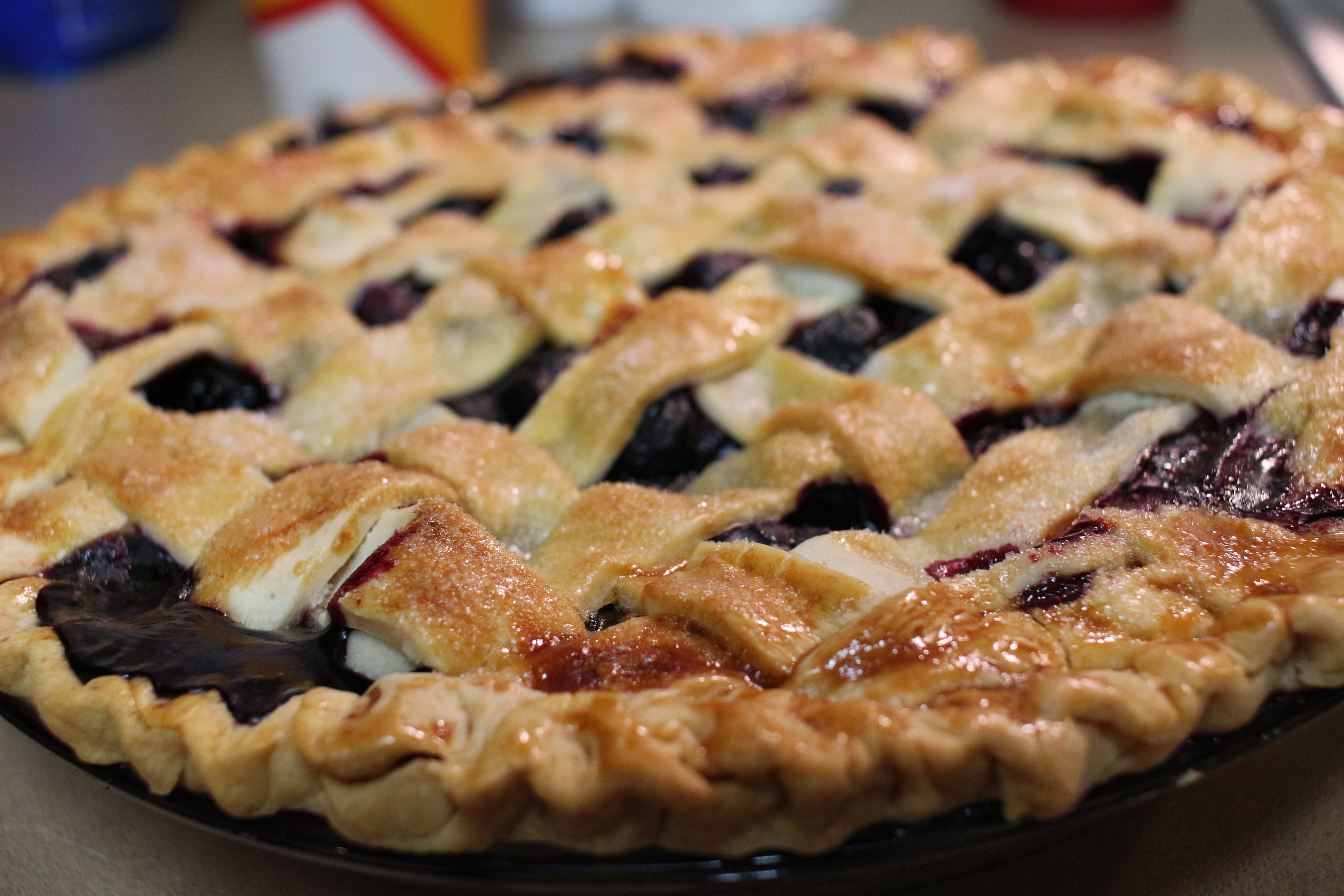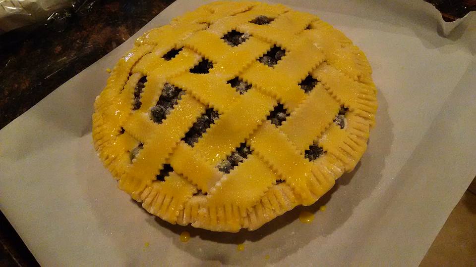 5. Once you’re ready to bake it , brush it with egg yolk wash , sprinkle generously with sugar and bake at 400 F for 20 minutes then lower it down to 350 F for about 55 – 60 minutes . The berries should be bubbly . To make sure cleaning up is not a messy job , line a parchment paper on a cookie sheet . Let the pie cool totally before serving . Serve with a huge dollop of vanilla ice cream !