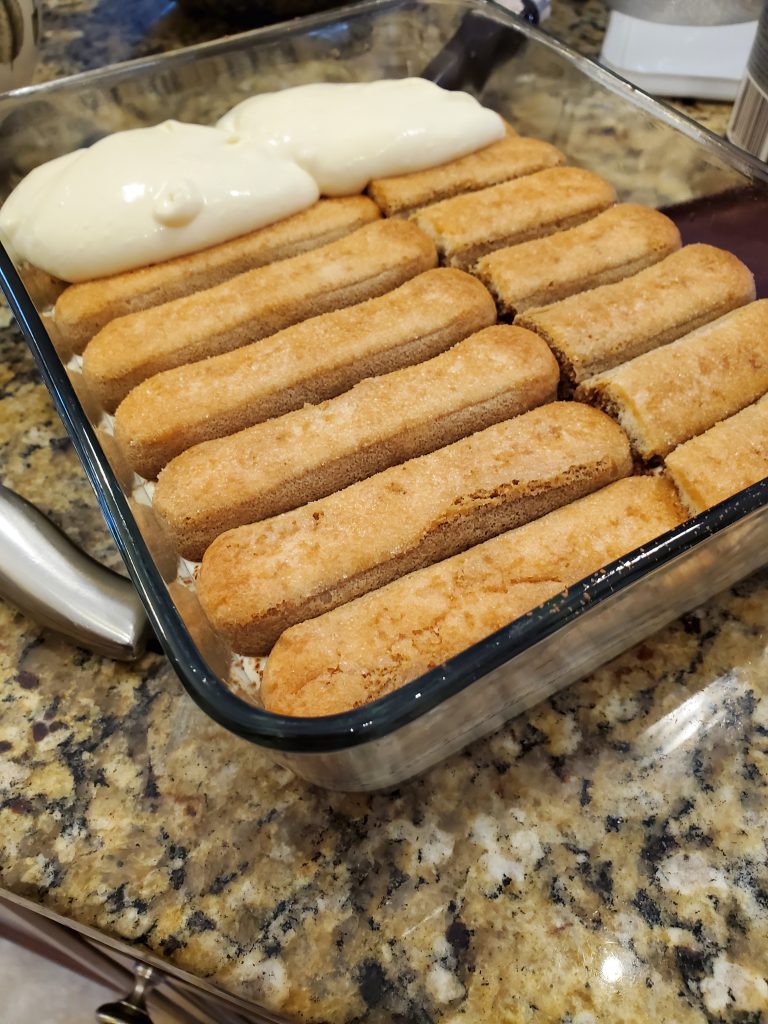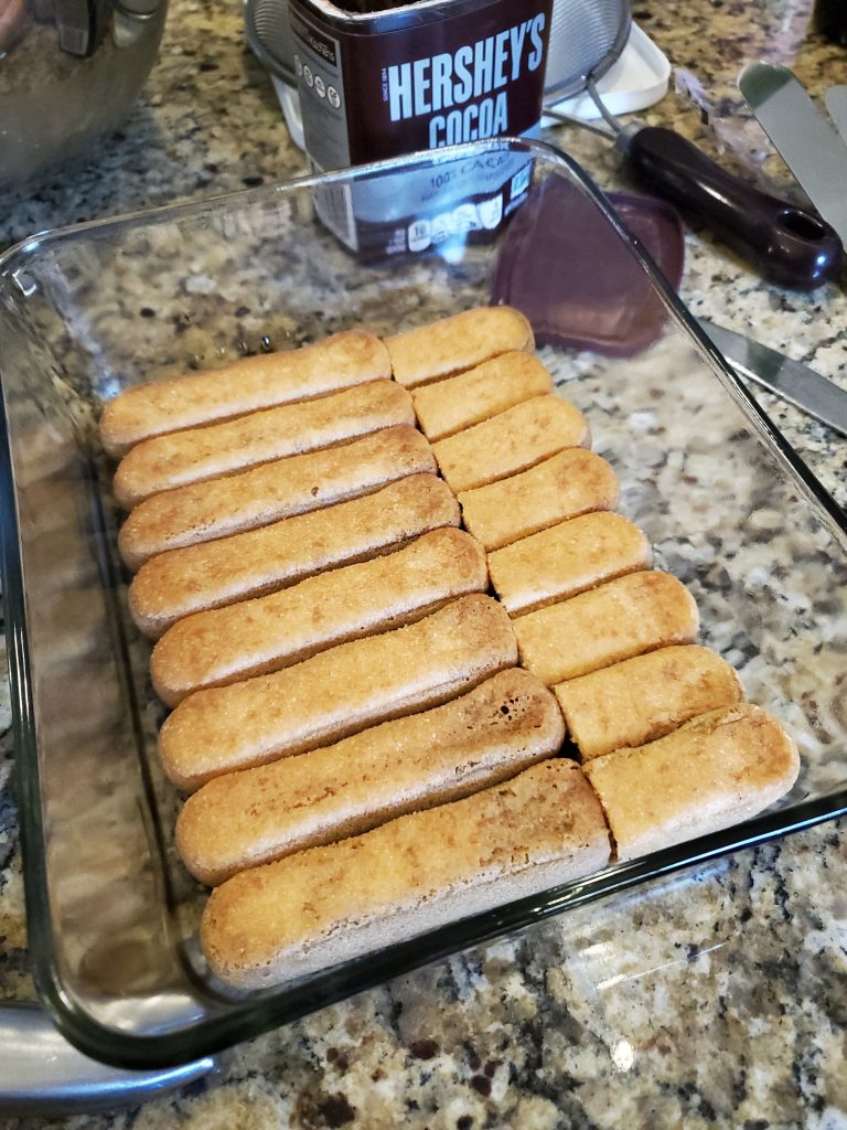 The base of this cake is made by soaking lady finger cookies , i bought Savioardi , which is the preferred type / kind to make tiramisu . Always good to have an extra package just incase you have some leftovers , of you have to waste some to make them all fit . You know it all depends on the shape and size of your dish you use .