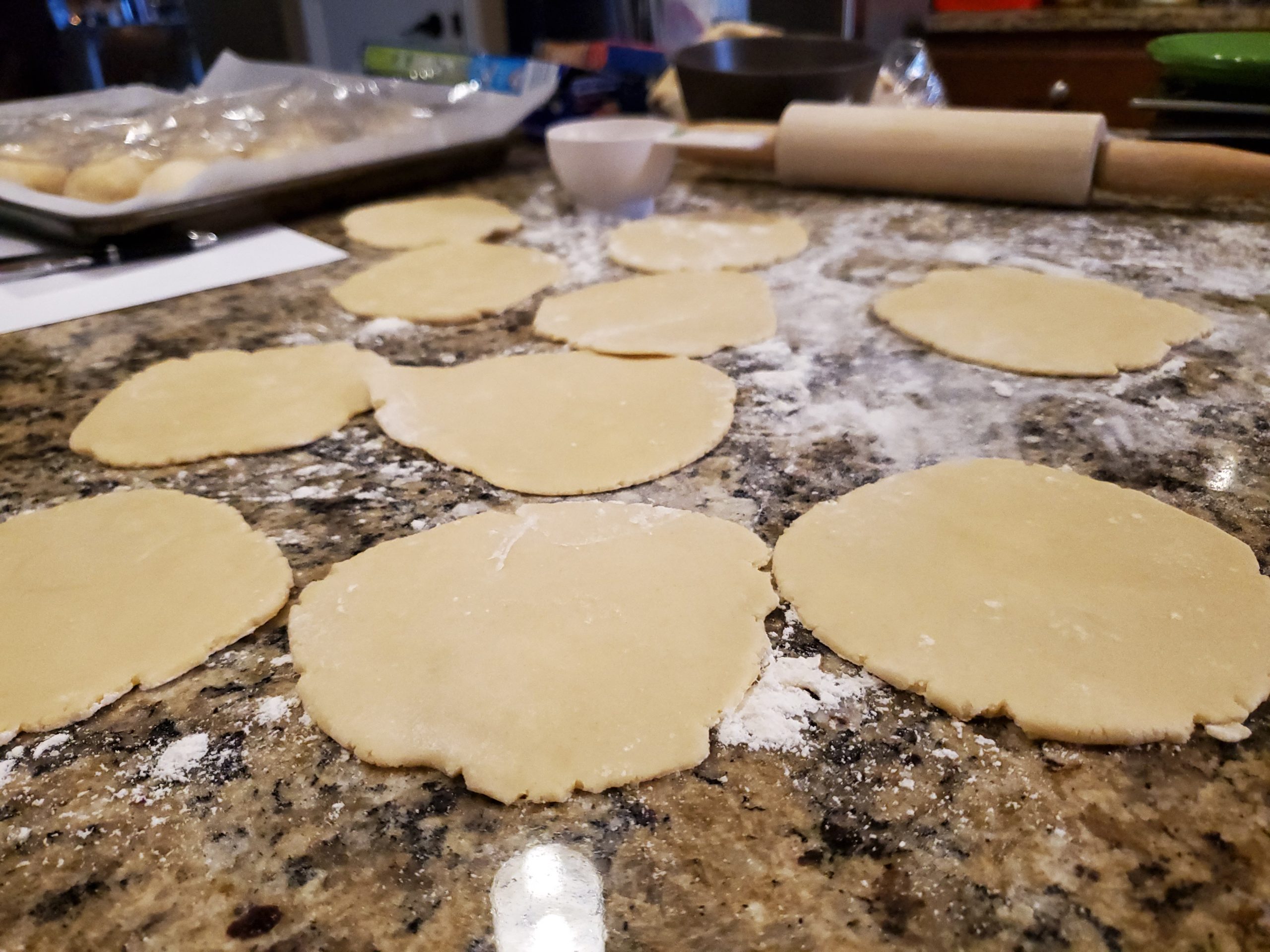 - Divide the cookie dough for the topping , about 30-32 grams size , shape into ball , flatten into a disk , using rolling pin , roll it out to a circle about 3.5 inch diameter , do the same with each one of them .