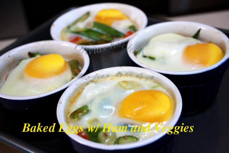 In a greased ramekins , layer ham on the bottom , then add the sauteed veggies , and top it off with eggs , and add 1 tbsp. heavy cream on top of the egg . Bake at 350 F , for about 18 minutes .
