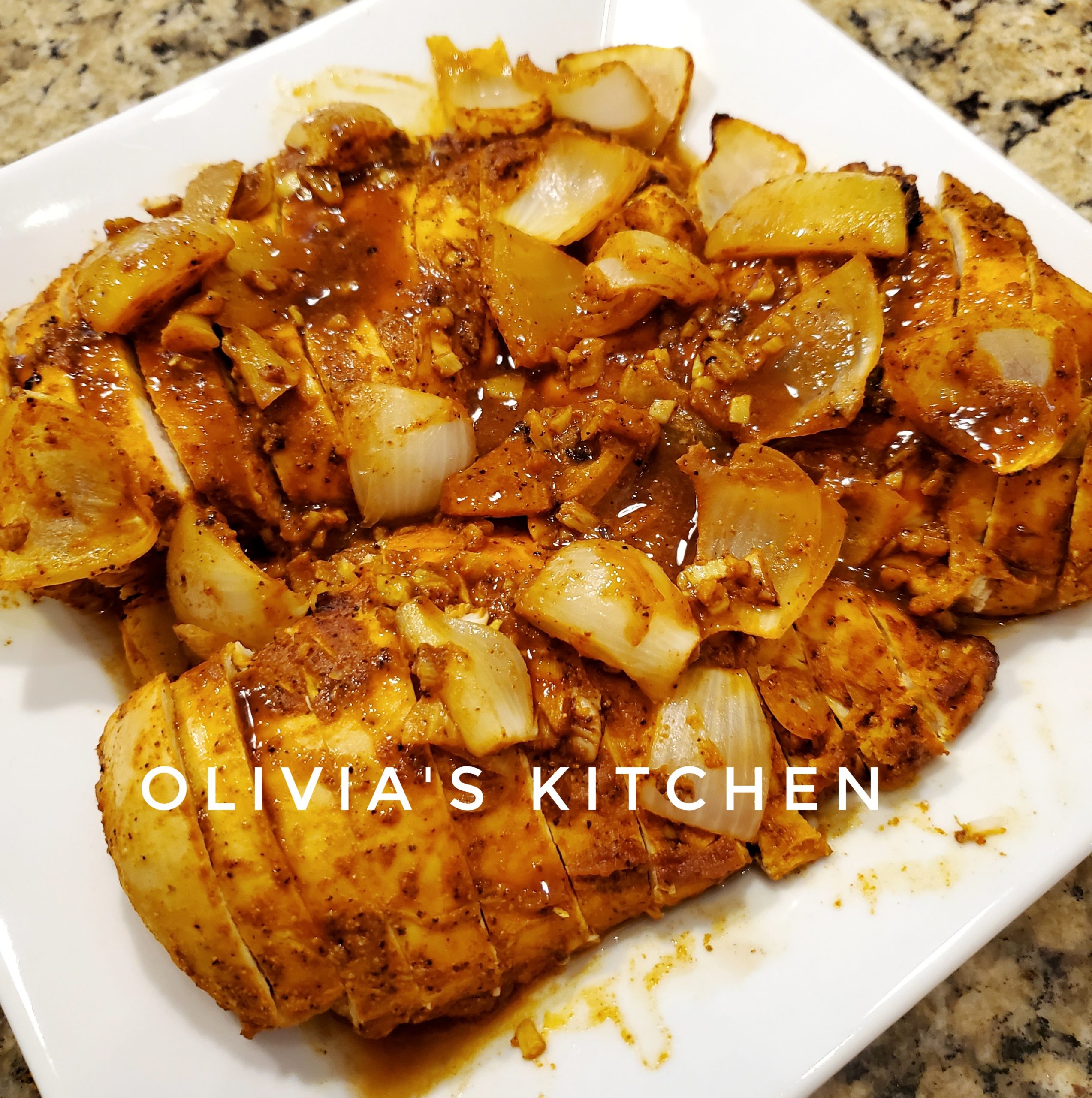 - Spray the cookie sheet with olive oil spray , place the chicken , juice and the onion onto the sheet , bake until the meat is done . If using chicken thighs , you’re probably good overcooking it a little bit , 35-40 minutes .