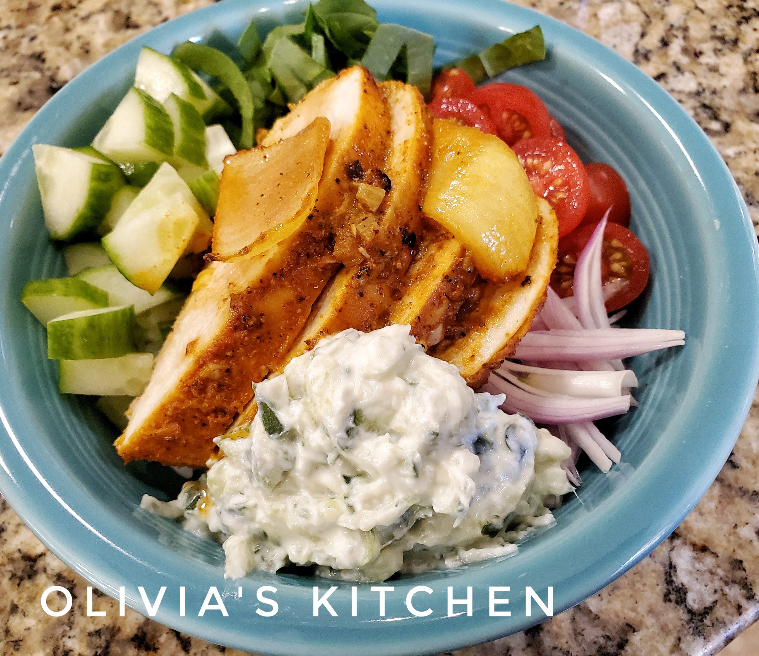 So whatever cut of chicken you use , make sure there is enough time to marinade them . At least 3-4 hours . You want to grill or pan fry or like me , roast it in the oven , whatever works . I serve this chicken on a bowl of rice , topped with chopped baby spinach , english cucumber , sweet cherry tomatoes , and the most important thing , tzatziki sauce .