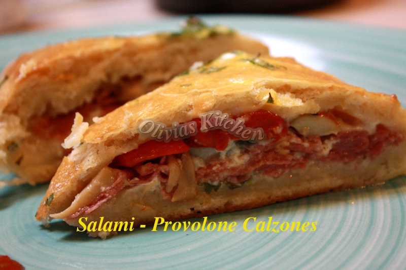 In a bowl , beat the eggs and parsley , set aside half of the beaten eggs . Add mozzarella into the half beaten eggs with parsley . Preheat oven to 400 F , preheat the baking sheet too . Roll out your pizza dough into 9 x12 rectangle on a parchment paper , spread the mozzarella egg mixture on the one half of the dough , topped with salami , mushroom and roasted red pepper , and provolone cheese . Fold the top over it , crimp well , and slide the calzone on the parchment paper into the preheated baking sheet , and bake for 15 minutes . Brush with the beaten egg mixture , bake for another 5 or 10 minutes until it’s golden brown . Serve with pizza sauce as the dipping sauce .